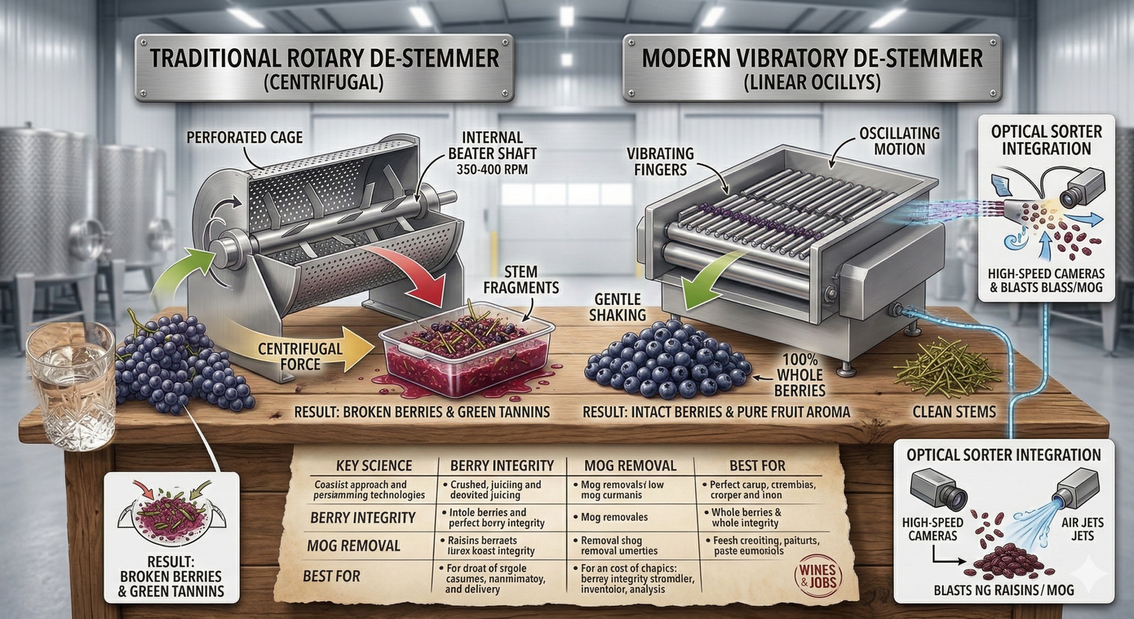 - The Risk: Broken berries lead to premature oxidation and “juicing” before the fruit reaches the fermenter.